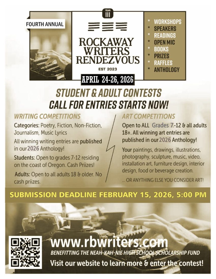 All winning entries will be published in an anthology and authors will be given the opportunity to read their works during the RWR weekend. You know you want to be published – here’s your opportunity. Get out your pen – I mean keyboard and get ready to enter the RWR Writing Contest. AND – again this year, RWR will also include an ART CONTEST – for students and for all/any adults. There are multiple categories – fiction, nonfiction, poetry and more. CASH PRIZES FOR THE STUDENTS!! So give us your best stories and art, mark your calendars and plan to join us for the fourth annual Rockaway Writers Rendezvous. The Rockaway Writers Rendezvous benefits writing scholarships for Neah-Kah-Nie High School students.