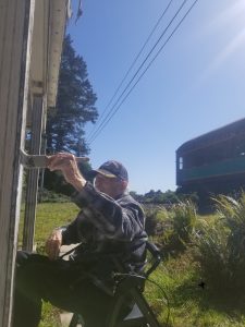 On Monday September 22nd, 101 year old Pat Patterson, retired Coast Guardsman put the first brush fulls of paint on the abandoned 1908 Barview Coast Guard Life Saving Station as the Oregon Scenic Railroad’s 100 year old McCloud 25 chugs past. Community members had gathered to launch the revitalization of this historic building, and enlisting the help of Pat Patterson to commemorate the momentous occasion.