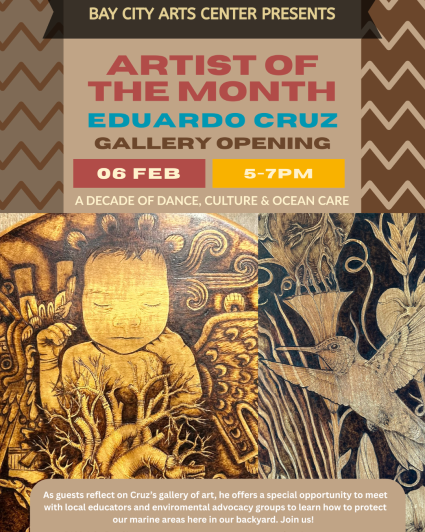 Join local communities and visitors alike this February and experience the spirit of the beloved annual Ocean Celebration—traditionally held each August at Cape Lookout—through two special events at the Bay City Arts Center. The events highlight the work of Eduardo Cruz, a self-taught mixed-media artist, performer, and the founder of Huehca Omeyocan, the cultural group behind the “Ocean Celebration”.