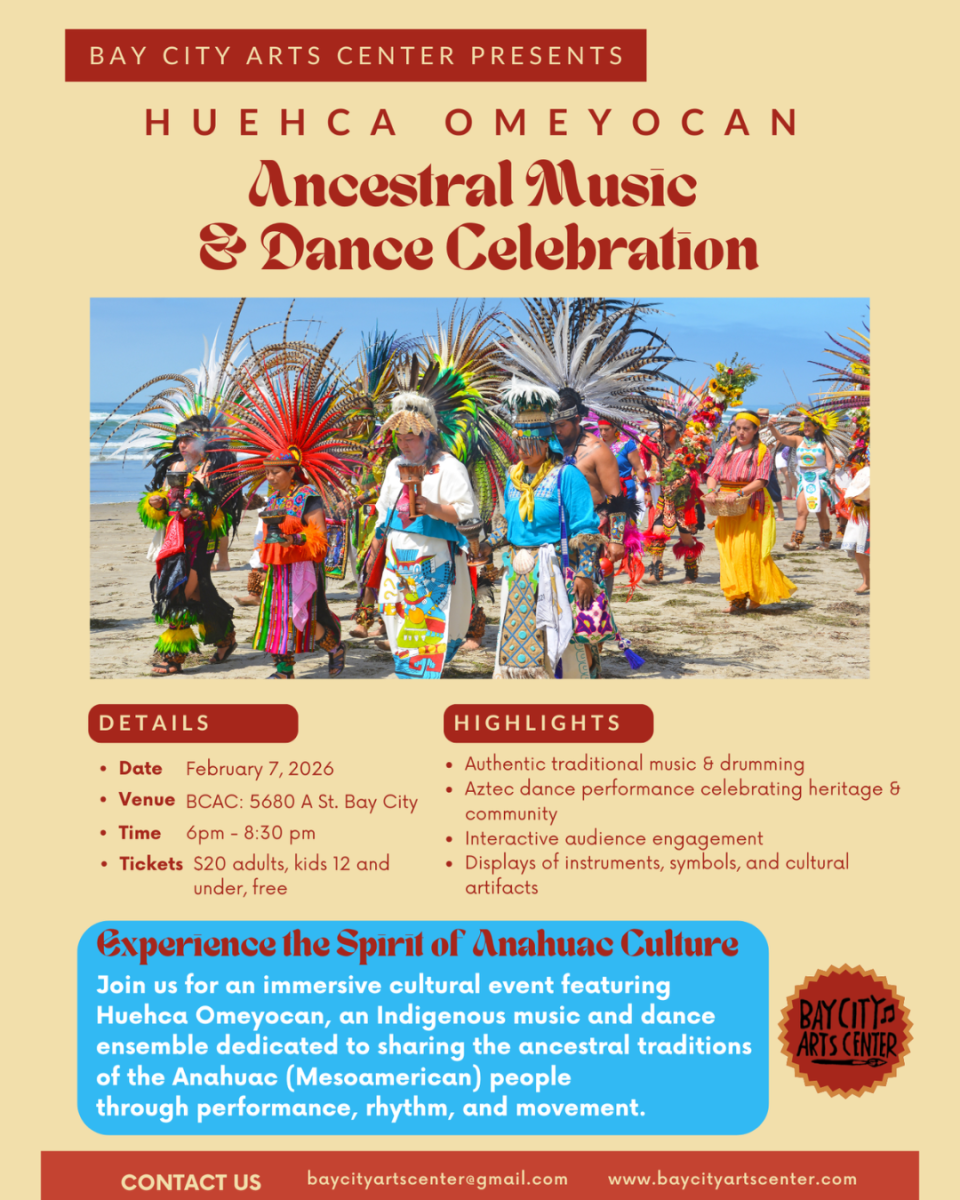 The celebration continues on Saturday, February 7, with a ticketed live performance at the Bay City Arts Center. Huehca Omeyocan, led by Eduardo Cruz, will present an Ancestral Music & Dance Celebration, featuring traditional drumming, Aztec dance, and interactive audience participation. “This immersive experience honors the living traditions of Anahuac (Mesoamerican) culture,” says Cruz. “The performance includes a beautifully curated display of instruments and artifacts from cultures across Mesoamérica, inviting audiences to engage, immerse, and connect with the rhythms and stories of these ancestral traditions.”
