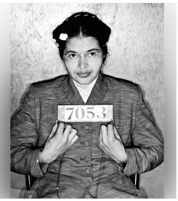 This is the 1955 booking photo of Rosa Parks taken in the Montgomery, Alabama jail. She had committed the heinous crime of sitting on a bus seat reserved for white patrons.