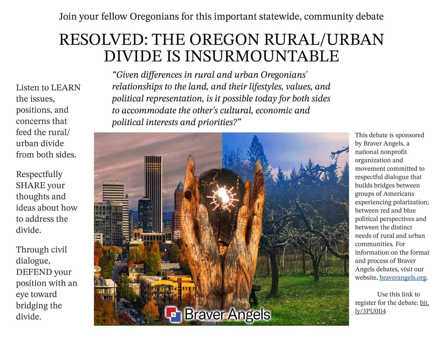 This Debate is presented by Braver Angels, www.braverangels.org, a nonprofit dedicated to reducing political partisanship and strengthening our democratic republic. Braver Angels plan to follow this online gathering with a series of in-person workshops, hopefully one in each county throughout the state, where we will bring urban and rural Oregonians together to discuss the Divide and look for constructive, mutually agreeable solutions.