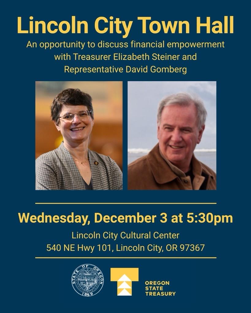 While I have your attention, I wanted to mention that I will be co-hosting a Town Hall with Oregon Treasurer Elizabeth Steiner at 5:30 pm on Wednesday, December 3 at the Lincoln City Cultural Center.