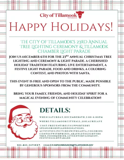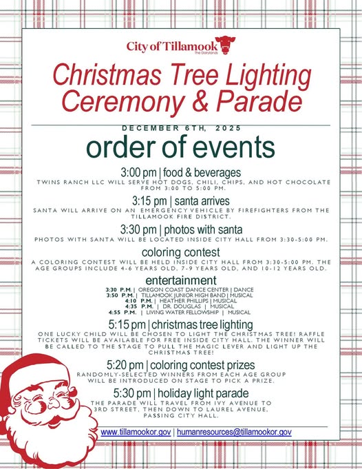 Join the City of Tillamook on December 6th for the 23rd Annual Christmas Tree Lighting & Light Parade. A cherished holiday tradition featuring live entertainment, food and drinks, coloring contest, photos with Santa and a festive light parade.