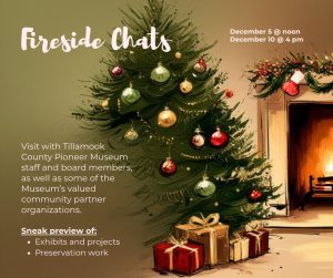 NEW THIS YEAR – The Tillamook County Pioneer Museum has two free community events happening – Friday, December 5 @ noon for Fireside Chats and then on Saturday December 6th from 3-7 pm for free admission, a kids holiday scavenger hunt, ornament decorating, and a forest of decorated Christmas trees!