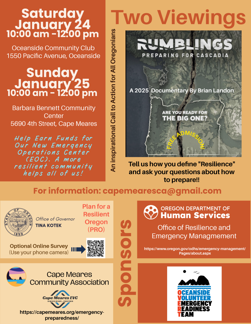 These events are designed to provide information about the much-anticipated Cascadia earthquake. In addition, Governor Kotek’s representatives from the DHS Office of Resilience and Emergency Management will invite local input for the ongoing effort to formulate a “Plan for a Resilient Oregon” or “PRO.” The PRO is a people-centered resilience strategy designed to help communities around Oregon adapt and prepare for increasingly likely disaster events. The video documentary, “Rumblings: Preparing for Cascadia” will also be shown followed by an opportunity for questions and comments. Cookies and beverages will be provided. For those unable to attend in person, please contact the Cape Meares Community Association for ZOOM login information at capemearesca@gmail.com.