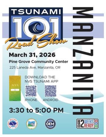 Join the Oregon Department of Emergency Management (OEM) and the Emergency Volunteer Corps of Nehalem Bay as we present Tsunami 101 on Tuesday, March 31 from 3:30 to 5:00 PM at Pine Grove Community House, 225 Laneda Avenue, Manzanita.