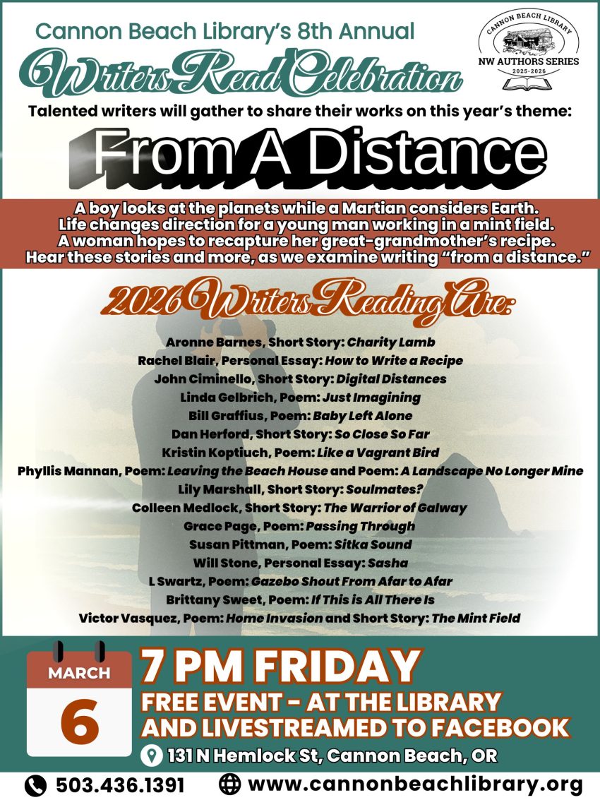 Some say perspective changes everything. The 16 writers from throughout the Northwest, Canada and Texas selected to read their pieces on the theme, “From a Distance,” for the Cannon Beach Library’s Writers Read Celebration, twisted their perceptions to encompass time, space and technology.