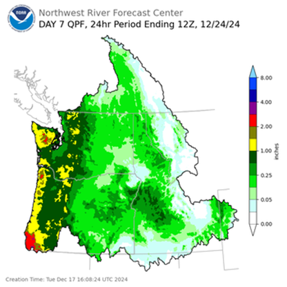 Now for the bad news, the extended models are showing another Atmospheric River event is possible next week, potentially spinning up some surface low pressure areas, that will being high winds and heavy rains over the Christmas holiday period. I have included some of the current modeling data that support this. In addition to this, the National Weather Service and the Climate Prediction Center are now suggesting that there is an increasing chance for an Atmospheric River event to impact the Holiday Travel Period. Their numbers say there is a 40-60% chance of heavy rain for the period of December 24, 26 and 27. There is also a moderate risk of high wind events associated with these systems. The heavy rains have the potential to cause Urban and Small Stream Flooding and also have the potential to lead to river flooding as well though at this time, it appears the threat is higher south of Tillamook County.