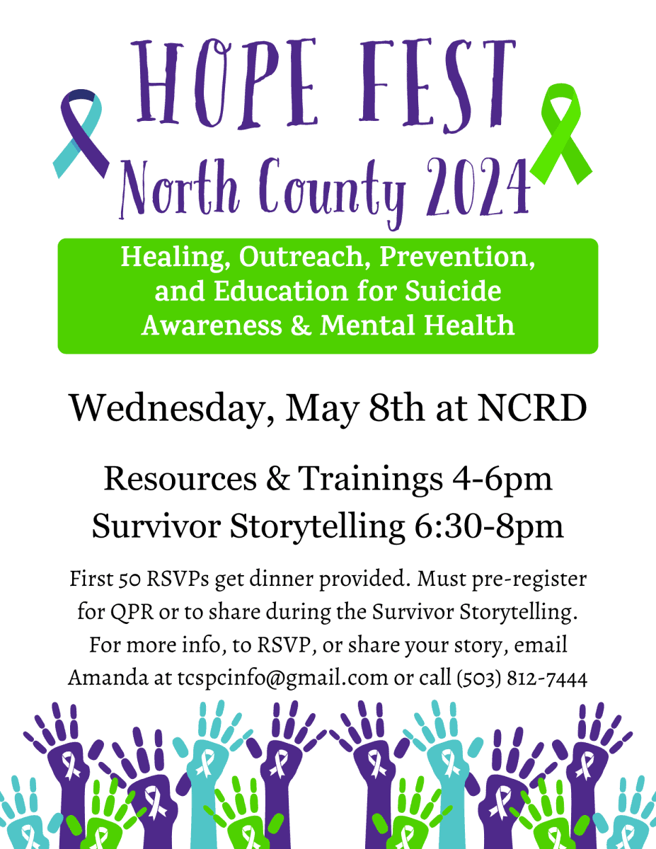The Tillamook County Suicide Prevention Coalition is gearing up for our upcoming HOPE Fest events to kick off Mental Health Awareness month throughout Tillamook County. We are bringing HOPE to each part of the county to make it more accessible. These events will each feature a resource fair, QPR (Question, Persuade, Refer) Suicide Prevention Gatekeeper training, and Survivor Storytelling all geared at erasing stigma around mental health and suicide — offering healing, outreach, prevention and education (HOPE) for those affected by mental health or suicide.