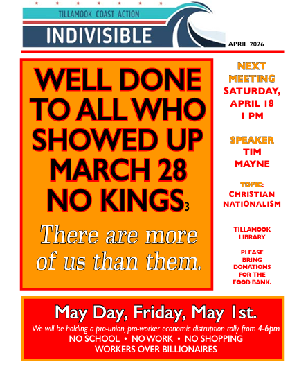 Before, and during the revolutionary war, the patriots stood for democracy, the idea of civil rights, and the rule of law. They spoke in town squares, made placards, wrote messages, had meetings, they wrote officials, and they contributed what they could. Today, we stand for the exact same things, only in 2026 style. That makes us Patriots. Patriots, see you on April 18th at 1:00 PM at the Tillamook County Library to hear pastor Tim Mayne speak about Christian Nationalism. See you on Mayday, May 1st at the rally from 4 – 6PM, or in Nehalem on the street every Saturday, the weekly protest in PC, or the Sunday protest in Tillamook. Bring your flag. Keep doing the hard, patriotic work that protects Democracy. Patriots. Yes, we are Patriots.