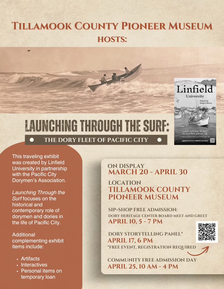 The Tillamook County Pioneer Museum will host a special traveling exhibit, “Launching Through the Surf: The Dory Fleet of Pacific City,” from March 20 through April 30 celebrating one of the most iconic and enduring fishing traditions on the Oregon Coast. Created by Linfield University in partnership with the Pacific City Dorymen’s Association, the exhibit explores the historical and contemporary role of the Pacific City dory fleet through stories, artifacts, and photographs gathered from the community.