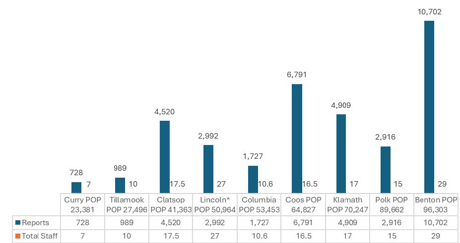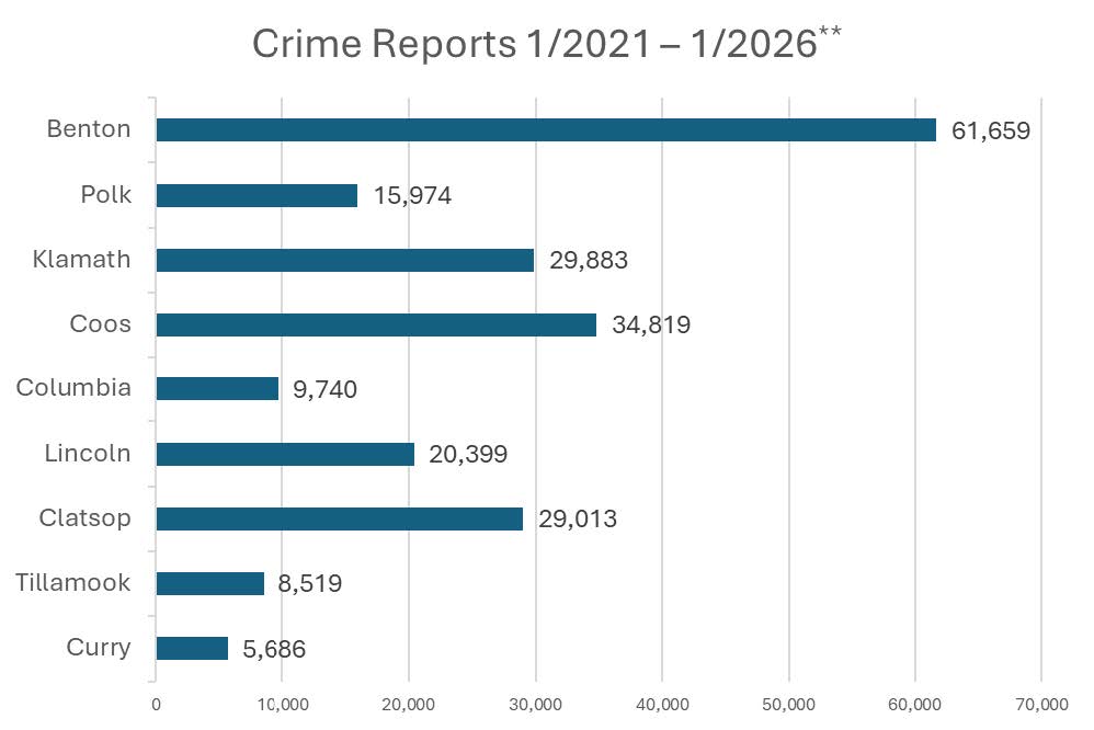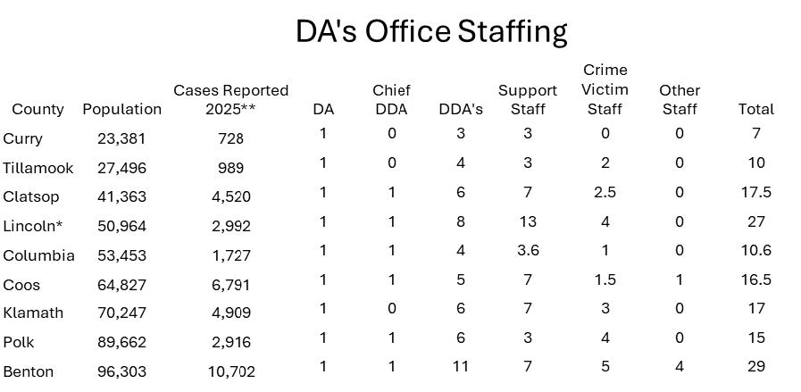 Coos County, with a population of 64,827, saw 6,791 crimes reported in 2025. Yet their district attorney’s office has just 15.5 staff positions. Klamath County has 70,247 residents and had about 2,000 more crime reports in 2025 than Lincoln County – 4,909 compared to 2,992. The Klamath County District Attorney’s Office has 17 staff positions.