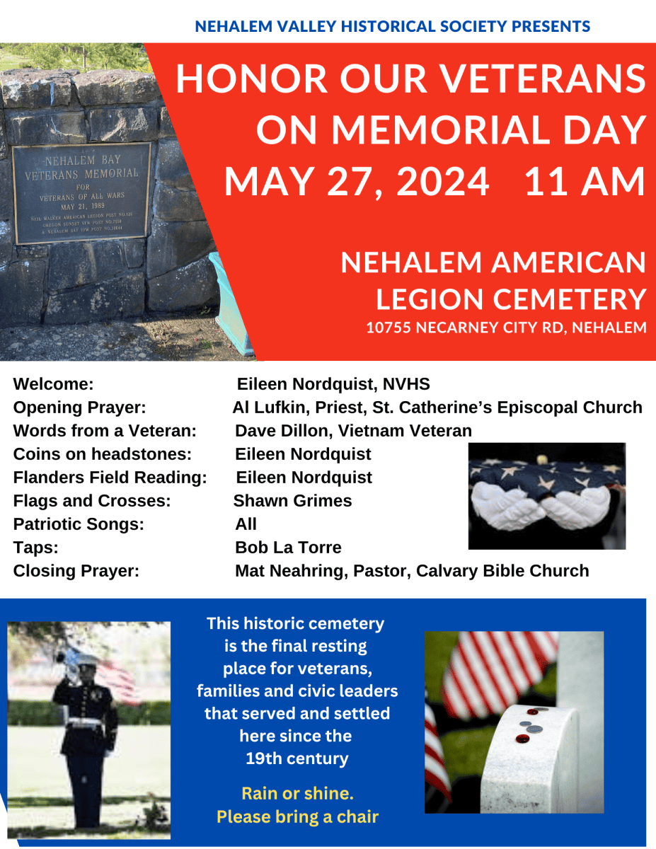 Memorial Day Services will be held at the Nehalem American Legion Cemetery, hosted by the Nehalem Valley Historical Society, starting at 11 am; Rockaway Beach’s Memorial Day Services will feature the Coast Guard color guard, hosted by Rockaway Beach Volunteers, also starts at 11 am, on Monday May 27th.