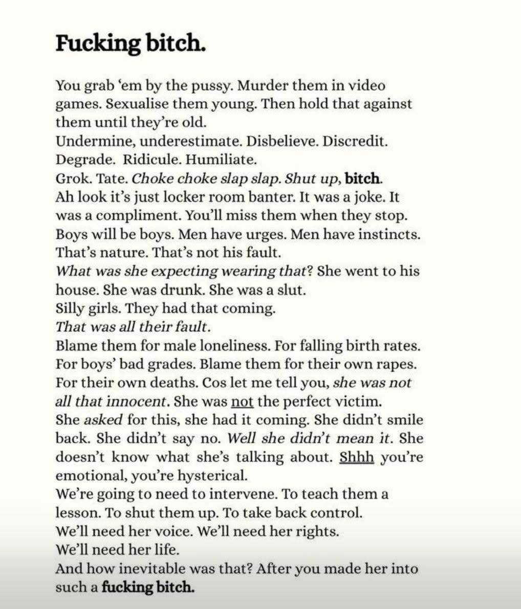 This looks to me like what women face every day in this country, domestic violence. Stay in line, respect your man, be a good wife, obey your master. Talking back, not complying with his wants, independence in any form will get you killed. When JD Vance, in a press conference, said, ”this was a tragedy of her own making,” he sounded like all those who cover for those that abuse women — to say “she was raped because she deserved it.” “she wore a mini skirt, it’s her own fault,” “she didn’t respect me, so I hit her,” etc. These are the common responses to validate violence against women. She deserved it, she caused it, it’s her fault.