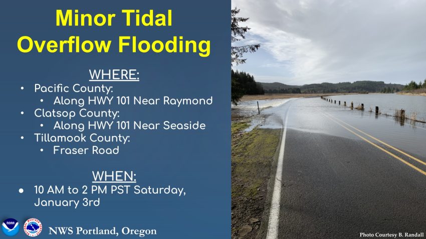 Minor Tidal Overflow Flooding expected between 10 AM–2 PM Saturday around high tide. Areas of concern include HWY 101 near Raymond, WA and Seaside, OR Clatsop County, and Fraser Rd in Tillamook County. Up to 1 ft of water possible in low-lying areas. Avoid flooded roads and allow extra travel time.