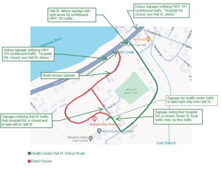 Working with the city of Wheeler an alternative route with signage has been identified to allow access to the existing Nehalem Bay Health Center and Pharmacy (the former Rinehart Clinic), the Nehalem Valley Care Center and residential areas above the construction site.