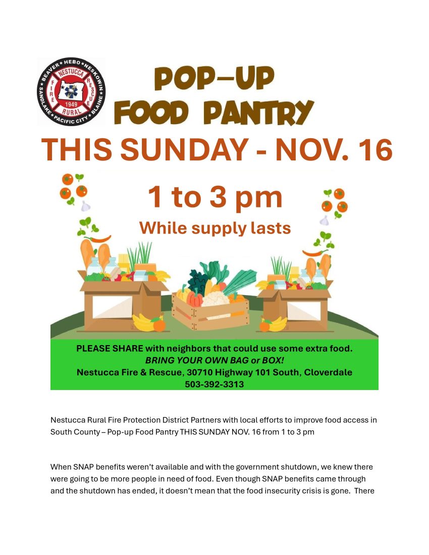 • Nestucca Rural Fire Protection District Partners with local efforts to improve food access in South County – Pop-up Food Pantry THIS SUNDAY NOV. 16 from 1 to 3 pm