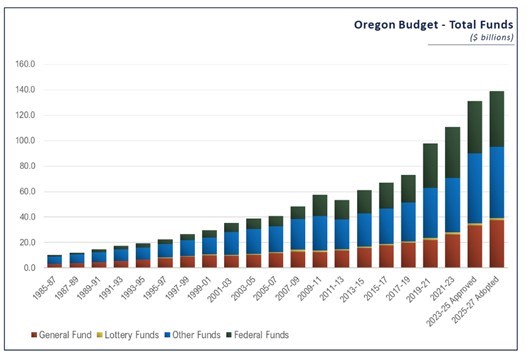 The legislatively adopted budget (LAB) for the 2025-27 biennium is $138.9 billion total funds, which is an increase of $7.7 billion, or 5.9%, from 2023-25. The total budget for 2025-27 includes $37.3 billion General Funds, $1.8 billion Lottery Funds, $56.1 billion Other Funds, and $43.7 billion Federal Funds. Combined General Fund and Lottery Funds of $39.1 billion increased 11.7% over the prior biennium. The increase is largely due to an 11.8% increase in General Funds. The General Fund has seen a continuing trend of double-digit growth since 2013-15. But current projections see that number leveling off. The following charts provide a history of Oregon’s total funds and General Fund and Lottery Funds budgets from 1985-87 through the 2025-27 biennia: |