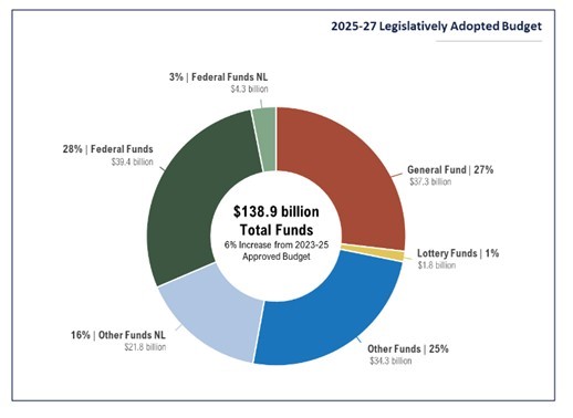 A constitutional amendment adopted by voters in November 2010 changed the historical Oregon every-two-year process into annual legislative sessions. The session is limited to 160 calendar days in odd-numbered years when a two-year budget is adopted. The Oregon Constitution requires that budget to be balanced. The “short” session in even-numbered years is limited to 35 calendar days. Budgets can be adjusted in the short session. Special sessions can also be called. Development of the 2025-27 budget followed a fairly normal course during the 2025 session: