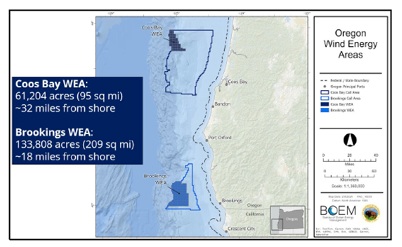 By 2024, the federal Bureau of Ocean Energy identified several sites off the coast of northern California and two sites off southern Oregon’s coast as having great potential for generating offshore wind energy. They included 61,200 acres near Coos Bay and nearly 134,000 acres off Brookings. The Coos Bay site is 30 miles from the coast, and the Brookings area is 20 miles away. Combined, they could potentially generate more than 3.1 gigawatts of renewable energy, enough to power 1 million households.