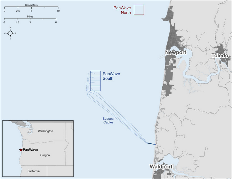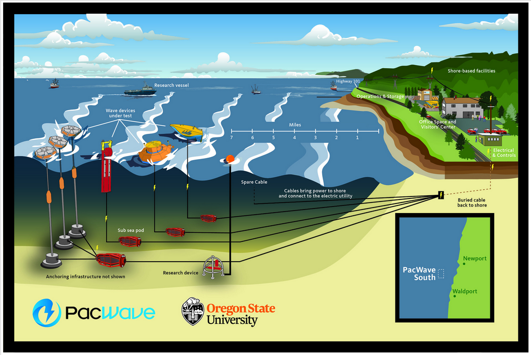 Seven miles out into the ocean off the central Oregon Coast, the PacWave test facility is invisible to the naked eye. It’s a rectangle—roughly 2 by 1 nautical miles—divided into four testing areas.