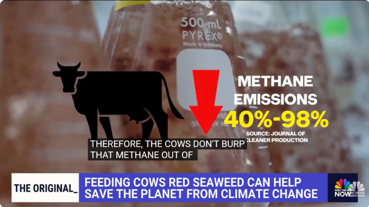 Methane is a potent greenhouse gas with 80 times more warming power than carbon dioxide, over a 20-year period. It’s responsible for about 30 percent of the global warming we’re experiencing today, and agriculture is the largest human source of methane emissions. Within that, cows are the single biggest offenders—burping out methane as a byproduct of their digestion process.