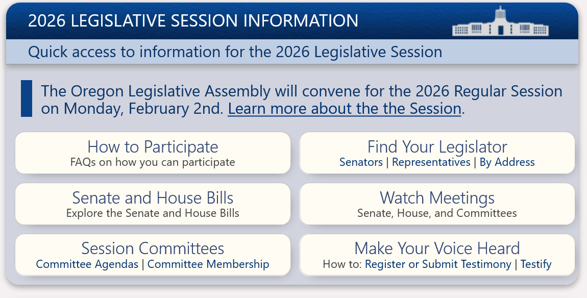 | The Oregon Legislative Website and the Oregon Legislative Information System (OLIS) have an abundance of resources to use for following along with the Legislative Session. Visit www.oregonlegislature.gov to find out: