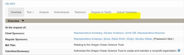 - To register, go to olis.oregonlegislature.gov, select the “Bills” icon on the top right corner of your page, enter the bill number, and select “Register to Testify.” Or, call 1-833-588-4500.