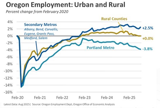 The state’s economic forecast puts the likelihood that Oregon will slip into a recession at 25%. Even so, the state has shed more than 18,000 jobs in the last year, according to the most recent available data, and its unemployment rate increased faster than any other state’s from August 2024 to August 2025. |
