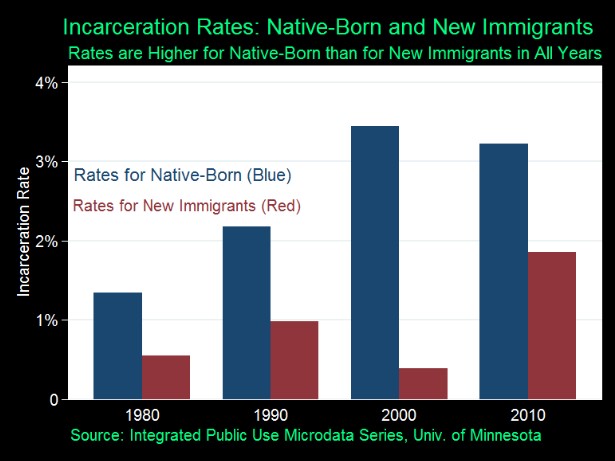 Unlawful presence in the US is a civil offense. Immigration proceedings occur in civil court, not in criminal court. And while much has been said about undocumented residents being “killers, rapists, and drug dealers”, the evidence proves otherwise. Recent immigrants are far less likely to be incarcerated than their native-born peers, according to United States Census data. |