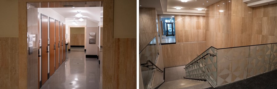 New all-gender restrooms and stairs leading down to the lower concourse.