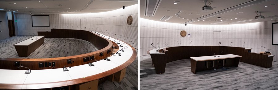 The inside of new hearing rooms 30 and 40 on the lower level.