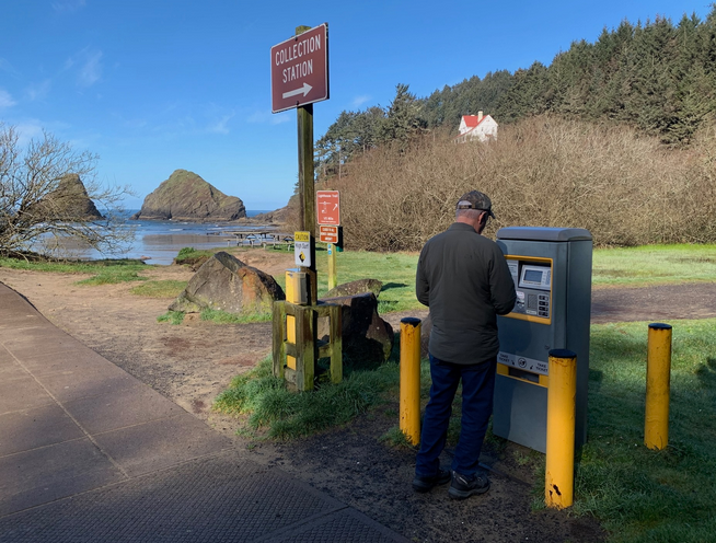 A visitor uses a machine to pay to park at Heceta Head Lighthouse State Scenic Viewport south of Yachats, which increased its fee from $5 to $10 in 2025. (Garret Jaros/Lincoln Chronicle)