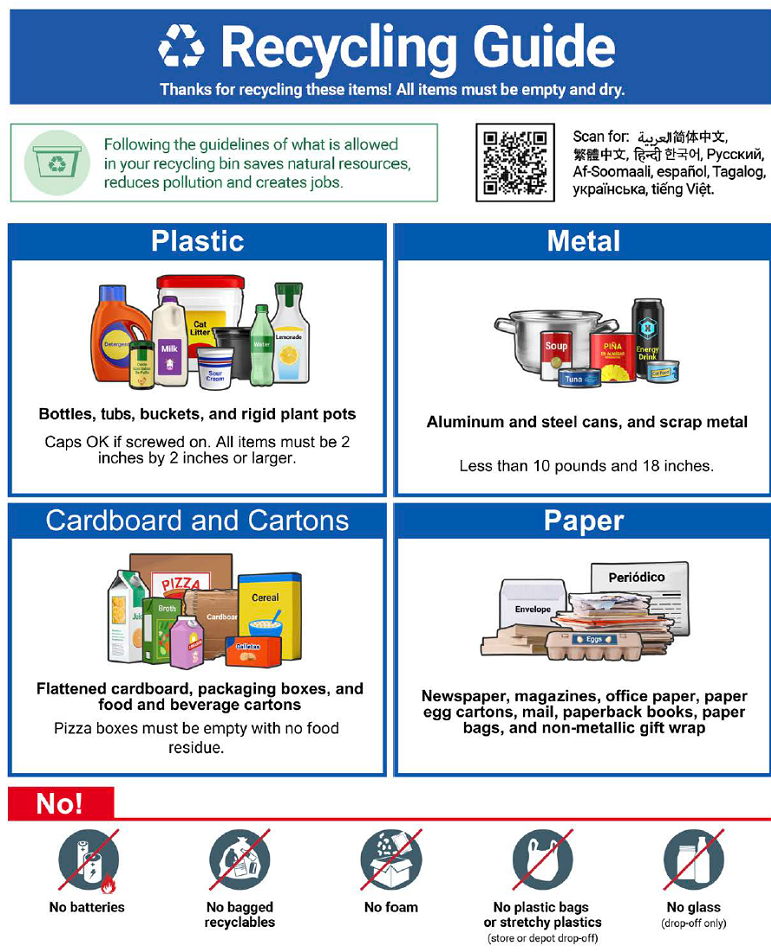 The Plastic Pollution and Recycling Modernization Act (RMA) went into effect on July 1st. This was the result of Senate Bill 582, passed during the 2021 legislative session. One of the main goals of the RMA was to adopt a “Universal Statewide Collection List” (USCL). The USCL means that everywhere you go in Oregon, the accepted recycling list of what goes in your curbside recycling cart will be the same! That’s a huge win!