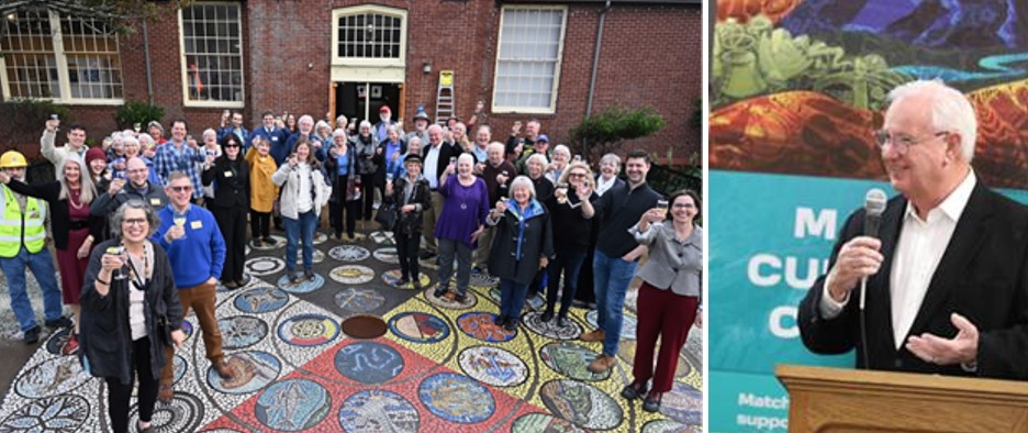 It was five years ago that I stood on the stage here and announced that we had secured $1.5 million. This delightful piece of art is the capstone of the plaza project that transformed playgrounds and parking lots at the old DeLake School into performance stages, public art displays, and a welcoming surround to the Center, where eight million cars drive by each year.