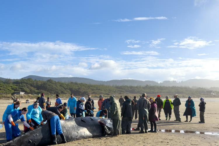 A large team from multiple organizations convened on Tuesday, November 18 to conduct a necropsy on the young humpback whale that stranded over the weekend near Yachats, Oregon.