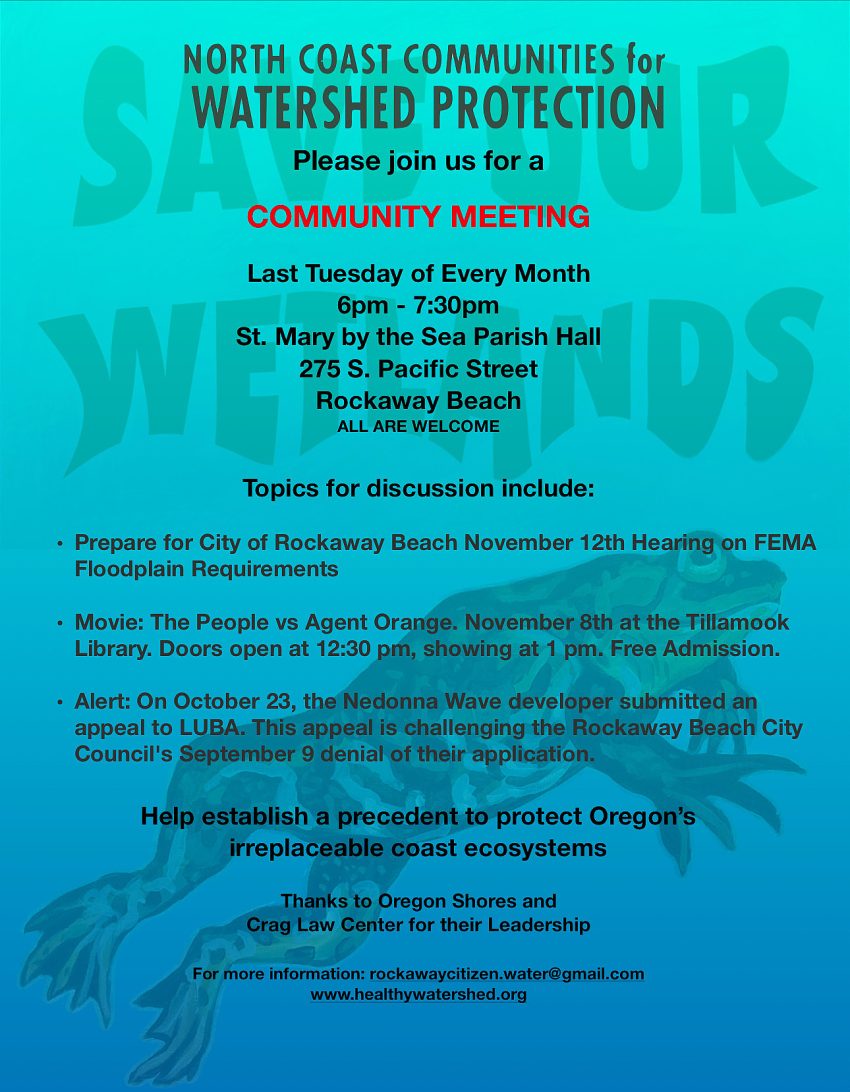 Tomorrow night please consider attending the next NCCWP general membership meeting at 6:00 p.m. this Tuesday, October 28, at the St. Mary by the Sea Parish Hall – 275 S. Pacific Street in Rockaway Beach, Oregon. ALL ARE WELCOME. The meeting will focus on the following three topics:
