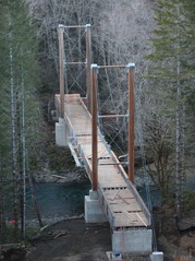The 250-foot suspension bridge over the Wilson River, seen here under construction, connects the Tillamook Forest Center with the Wilson River Trail System. As part of the 20th anniversary celebration visitors can walk across the bridge and release Steelhead fry into the river April 4. Check out the website for more events and times: https://www.tillamookforestcenter.org