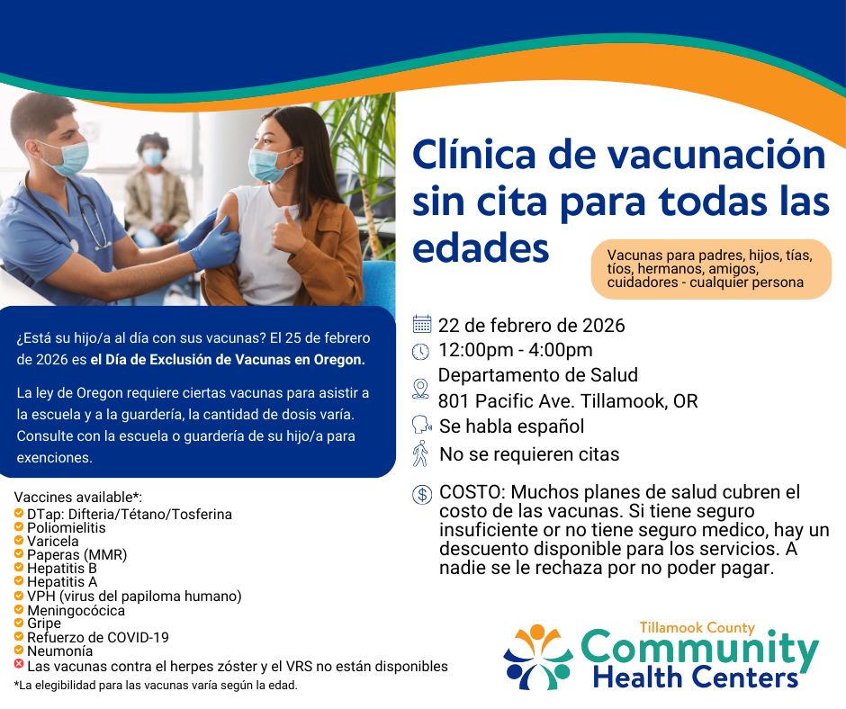 Tillamook County Community Health Centers is hosting an All Ages Walk-in Vaccine Clinic on 🗓Sunday, February 22nd from 🕛12:00pm – 🕓4:00pm at the Central Clinic, 801 Pacific Avenue in Tillamook. No appointment needed. 💲Many health plans cover the cost of vaccines. A sliding scale fee is available for those who are under or uninsured. No one is turned away for the inability to pay. Come in and get your entire family vaccinated prior to Oregon Immunization Exclusion Day!