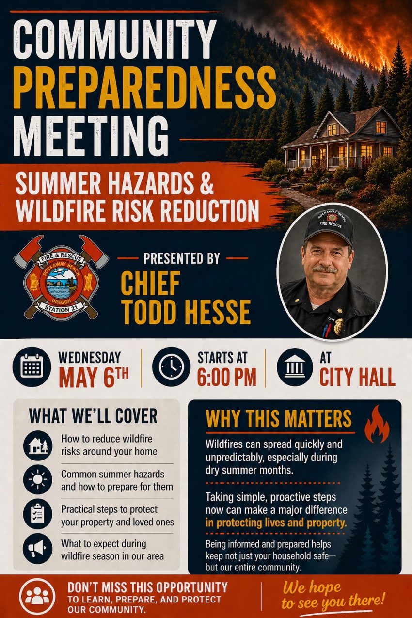 Join us for an important Community Preparedness Meeting featuring Rockaway Beach Fire Chief Todd Hesse, who will be sharing valuable information on how to reduce wildfire risks and keep your family, home, and community safe.