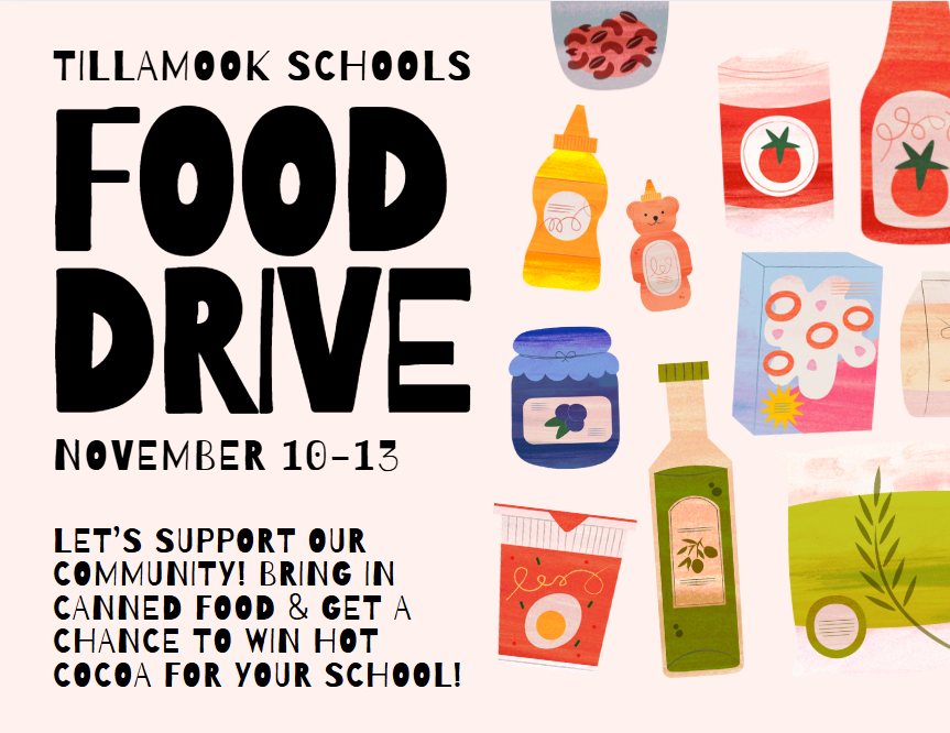All TSD9 Schools will be collecting canned food November 10 – 14. Food can also be dropped off at THS or the Tillamook School District Office. Food collected will help stock school food pantries. The schools are competing to see who can collect the most food to win hot cocoa for their school. So drop off your nonperishable (not expired, please!) food items to your favorite Tillamook School today. Thanks in advance for your help and support!