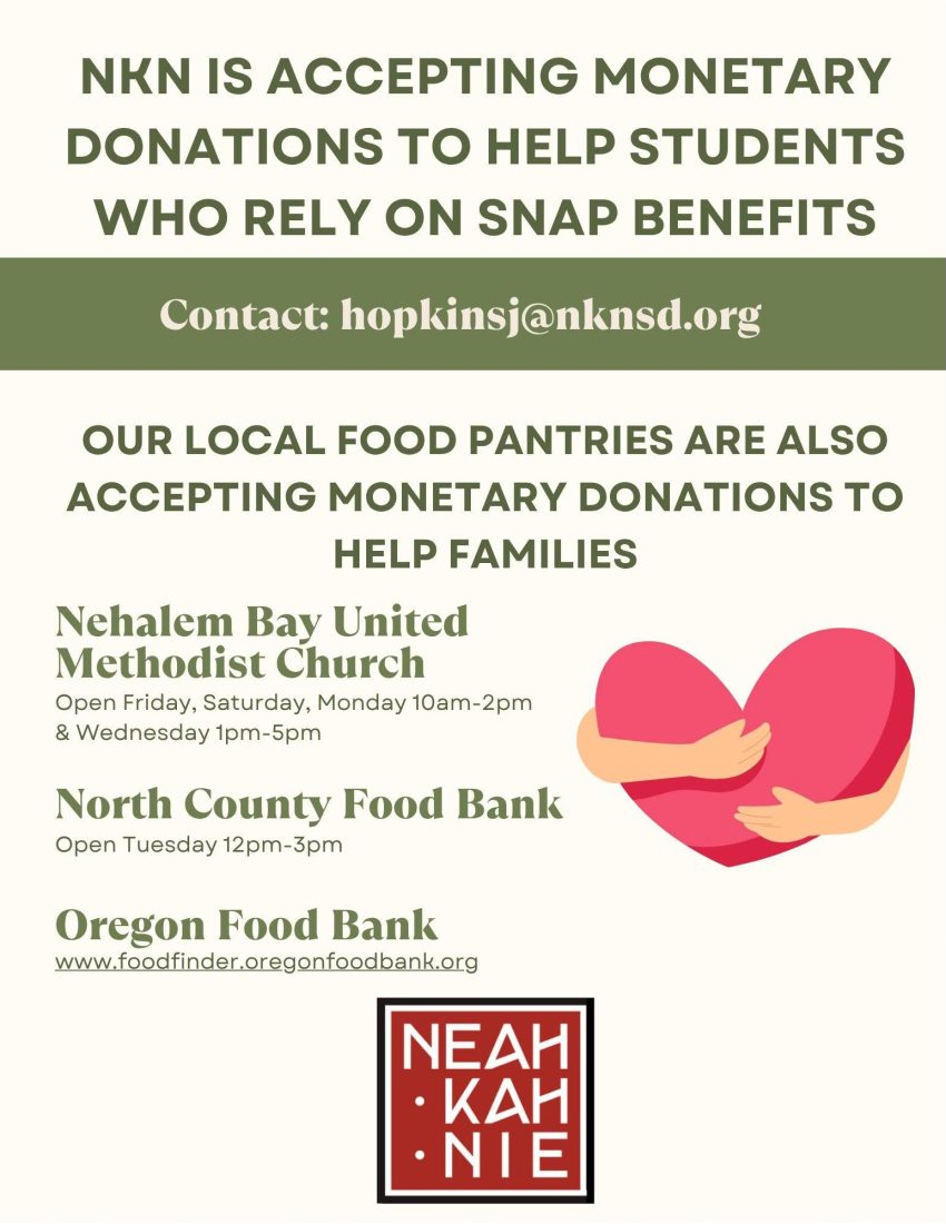 The Neah-Kah-Nie School District has Family Resource Centers which provides for Nehalem and Garibaldi Grade Schools and the Middle and Senior High School in Rockaway Beach. Included in their services is a backpack program which sends food home with students on the weekends. It also works on providing food to students during the Thanksgiving and Christmas holidays. Find out what they do for our students by visiting their web site: Family Resource Center – Neah-Kah-Nie School District.