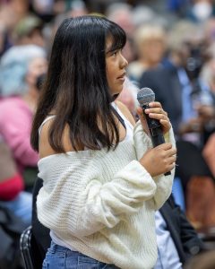 Wyden was also joined by Abril Aldama, a teenage girl whose father was detained in September. Many had seen her compelling testimony at the Newport City Council meeting the week prior about what her family is enduring, and how her father has never committed a crime. Wyden allowed her to speak at the beginning at the town hall and also at the close. She received a standing ovation and was praised for her bravery.
