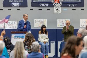 Senator Ron Wyden walked into the Newport High School gym last Sunday afternoon, shouted, “Hi everyone!” and was greeted by a rousing standing ovation from the over 500 people attending.