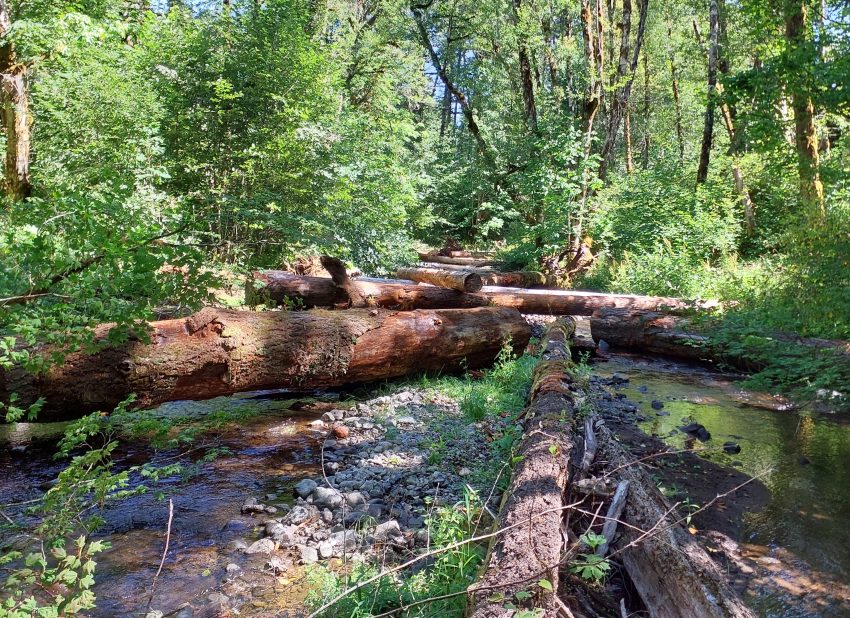 Gales Creek is a tributary to the Tualatin River in Washington County and is home to several important fish species including Endangered Species Act-listed Coho Salmon and Winter Steelhead. Other fish in the creek include Cutthroat Trout, Rainbow Trout and other native resident fish species.To reduce costs, appropriately sized trees for the stream characteristics were selected from an adjacent timber sale and decked near the proposed placement sites. An excavator was used to move the trees from the log decks and place into the stream.