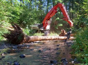An excavator places one of 30 trees with root wads attached into Gales Creek to help improve stream habitat for fish and other species. The trees that were placed will help influence the formation of pools, spawning gravels and provide cover for aquatic dependent species.