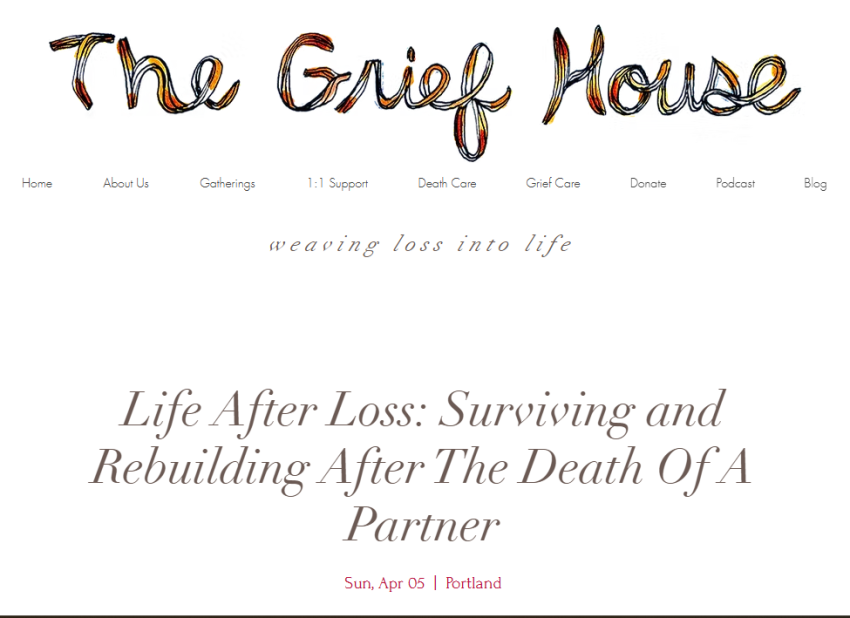 Starting in April, on the first Sunday of every month, Adam Sawyer will be facilitating group grief sessions based on the seasons that will explore different aspects of grief and mourning. The series is called “Life After Loss: Surviving and Rebuilding After the Death of a Partner,” and will convene at The Grief House in Portland starting on Sunday, April 5th.