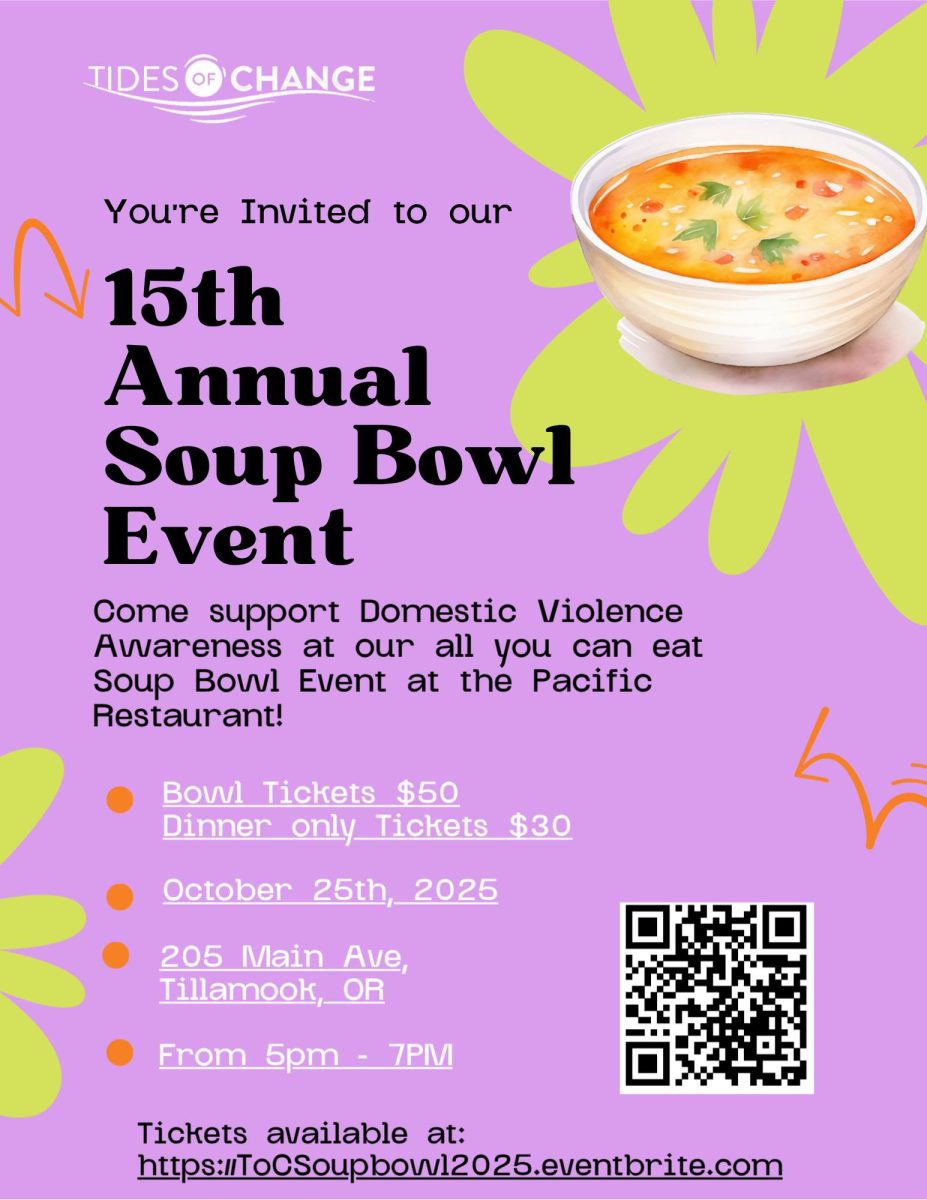Tides of Change (TofC) will hold the 15th Annual Tillamook Soup Bowl event beginning at 5pm on Saturday, October 25, 2025 at the Pacific Restaurant in Tillamook. Join us for this special evening that features 150 unique soup bowls created especially for this event by Northwest potters along with an extensive variety of soups, artisan bread and desserts donated by local area individuals and restaurants.