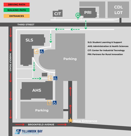 The construction on Tillamook Bay Community College’s new Administration & Health Sciences Building continues with completion and opening soon, and access to the campus is changing. This is a permanent change to campus access, starting on Tuesday January 20, 2026. Visitors and students to the TBCC campus will no longer enter through the Fairgrounds.